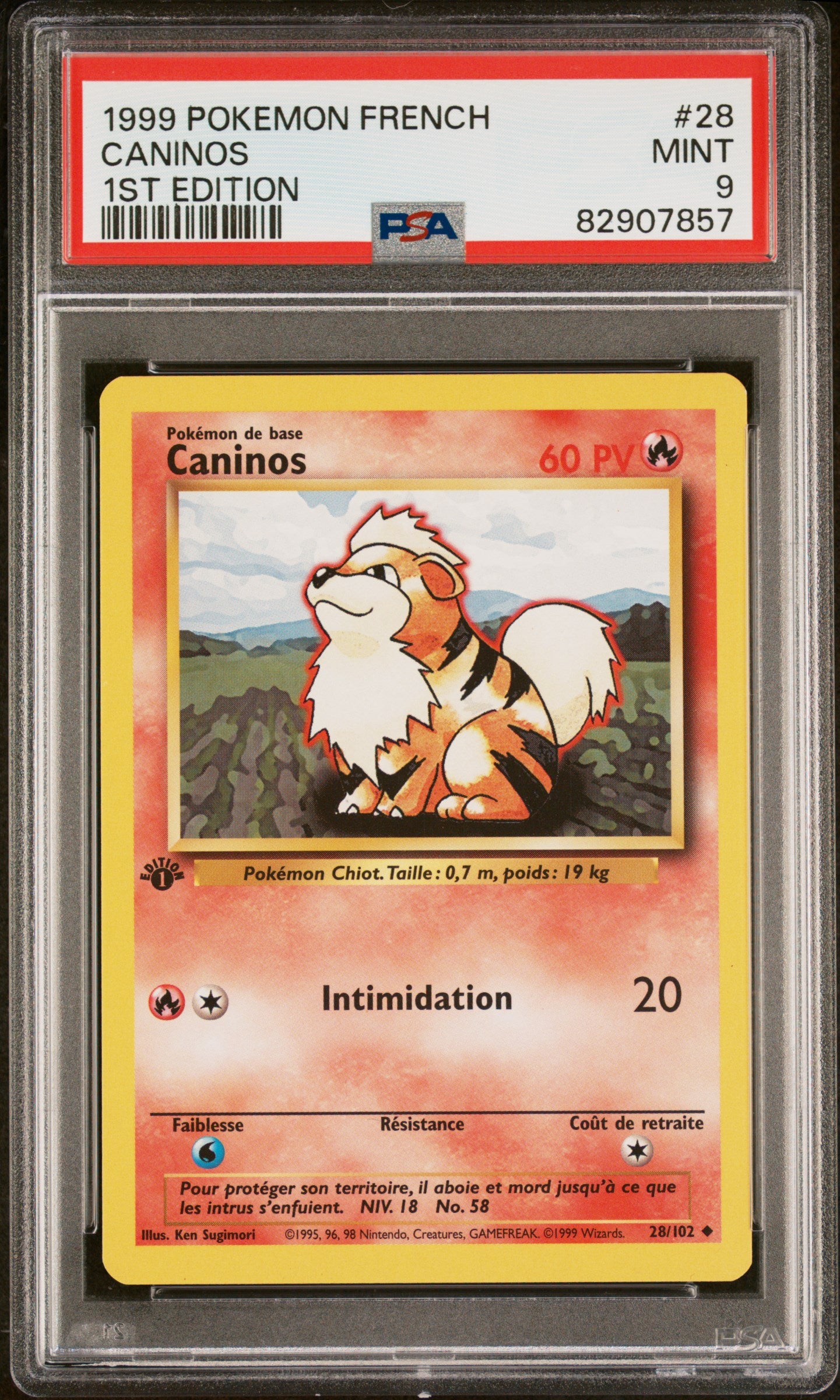 Carte Pokémon Caninos ED1 28/102 Set de base PSA 9
