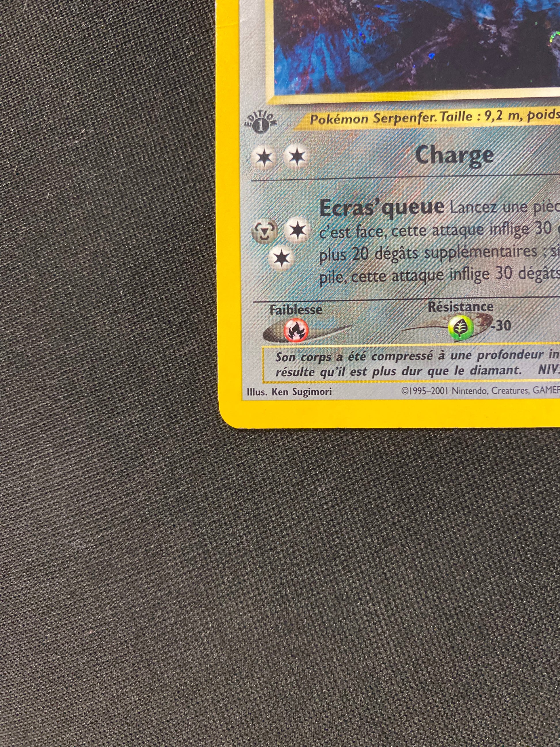 Ces défauts sont généralement liés à la fabrication de la carte et sont apparus dès sa sortie du booster. La carte a été immédiatement placée sous sleeve pour la protéger. Informations complémentaires :
