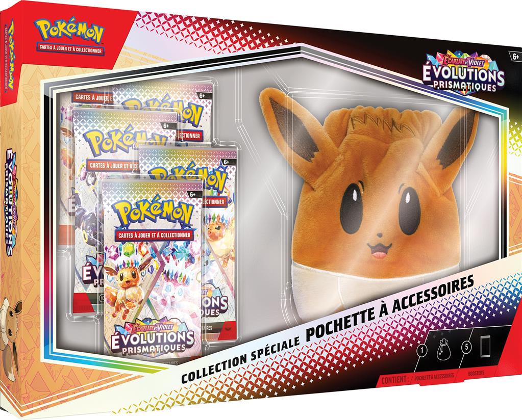 Évoli est une petite boule de poils trop mignonne qui est sûre de mettre un sourire sur le visage de toute personne croisant sa route. Que vous vous rendiez à une session de Ligue Pokémon ou que vous alliez vous promener en vile, Évoli sera toujours à vos côtés grâce à cette pochette à accessoires toute douce ! Les longues oreilles d'Évoli donnent un style unique à la pochette et le cordon situé à son extrémité vous permet de garder vos pikèces et accessoires en sécurité. Cette collection contient également des boosters de l'extension Écarlate et Violet - Évolutions Prismatiques, pour vous amuser encore plus !
