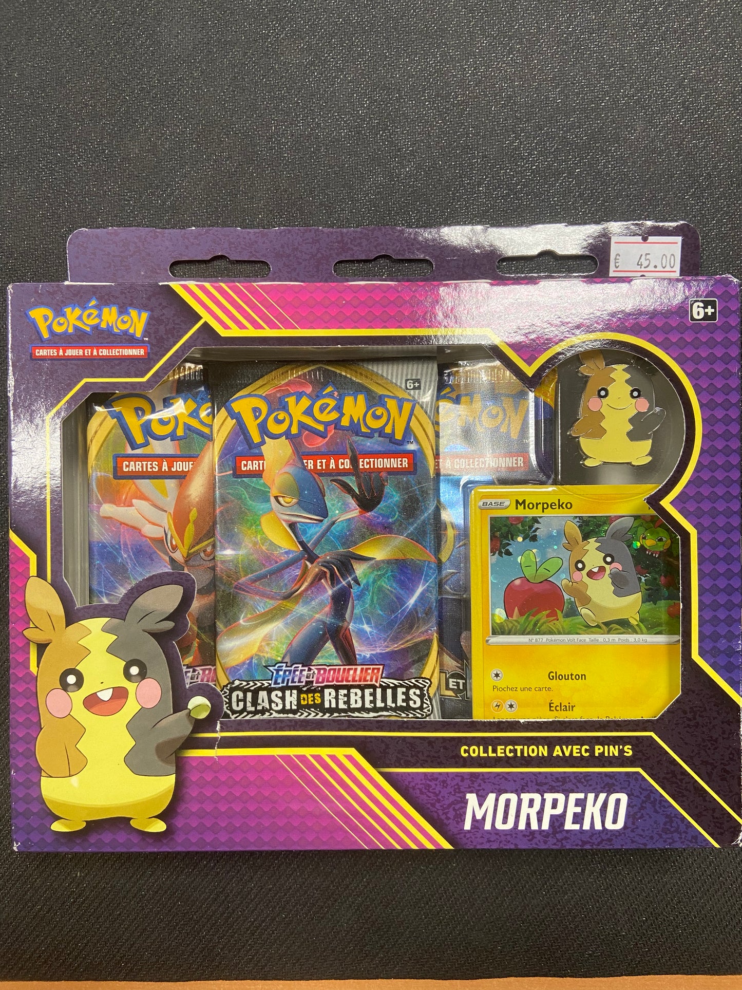 Retrouvez dans ce coffret Collection avec Pin’s Morpeko, une carte promo unique de Morpeko en mode Rassasié ainsi qu’un magnifique pin’s et 3 boosters de cartes Pokémon en Français !