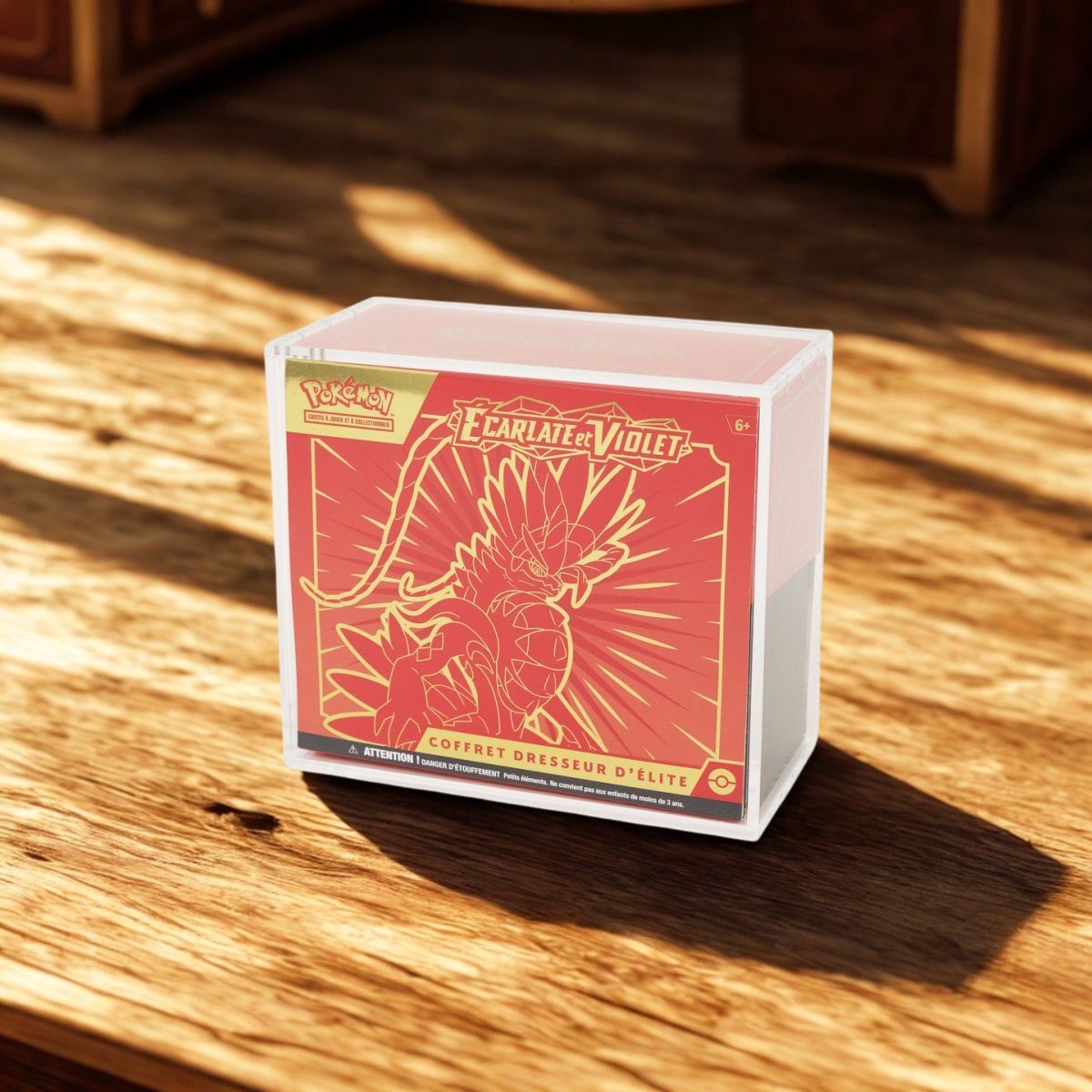 Protection de haute qualité : notre boîte est fabriquée en acrylique résistant, intégrant une protection UV à 99,9% pour préserver vos coffrets dresseur d'élite des effets nocifs des rayons ultraviolets, garantissant ainsi une conservation optimale de vos précieux items.